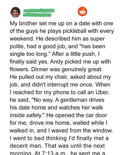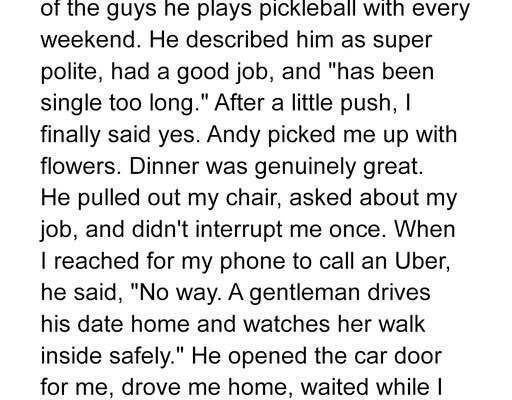Andy arrived with wildflowers, held doors, and genuinely listened during dinner. He seemed perfect—attentive, kind, and without quirks. By the end of the night, I even let him drive me home, breaking my usual first-date safety rule.
