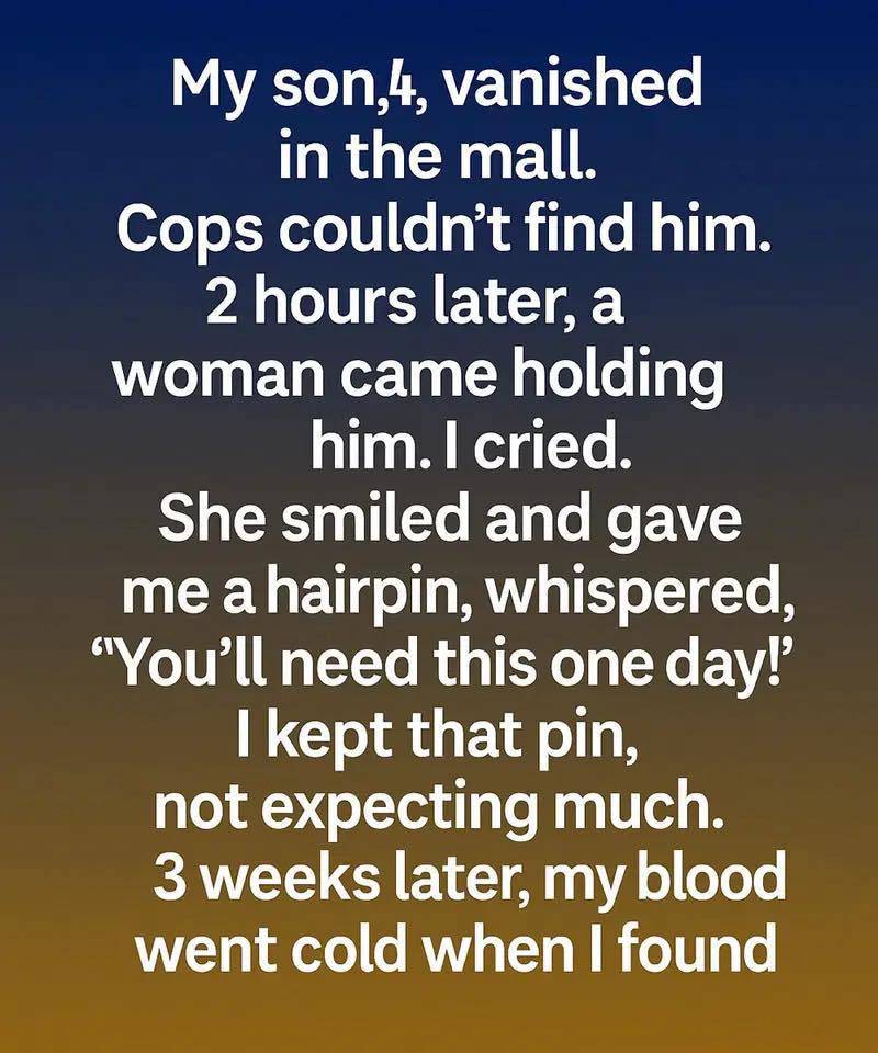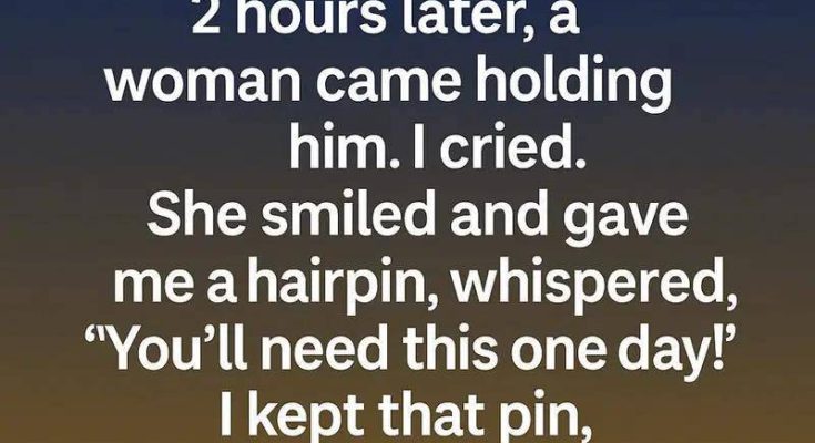 Two hours later, a woman emerged from the crowd carrying my son. He was calm, unharmed, even smiling. Relief left me shaking. Without explaining where she’d found him, she placed a small metal hairpin in my hand and said softly, “You’ll need this someday,” before disappearing.