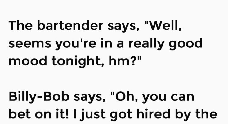 The following Monday, Billy-Bob returned even louder, pockets clanking with quarters, insisting on two more rounds for the house. When the bartender mentioned his paycheck would arrive in two weeks, Billy-Bob froze, stared at the coins in his hands, and whispered in awe, “Wait… they’re gonna pay me too?”