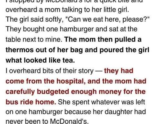 The woman wasn’t looking for a story that day. She had only stopped at McDonald’s for a quick coffee, planning to sit for a few minutes before heading out. That’s when she overheard a soft conversation at the table next to hers. A little girl asked her mother, almost whispering, if they could eat there. There was no excitement in her voice, just hope. They ordered a single hamburger and sat down nearby, trying to make the moment last as long as possible.