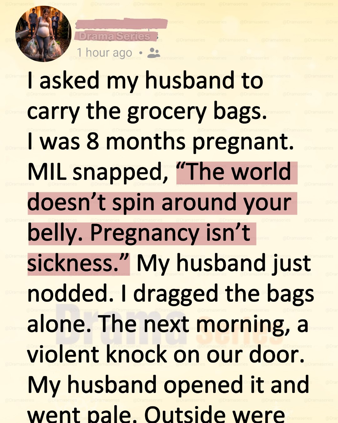 The evening should have been ordinary. I was eight months pregnant, exhausted and aching, when I asked my husband to carry the grocery bags. Before he could respond, my mother-in-law cut in sharply.