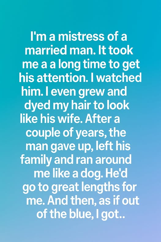 What began as small conversations turned into something more. Then meetings. Then secrets. After a couple of years, he made the decision I had been waiting for — he left his family. Just like that, he was fully mine. He revolved around me, did everything I asked, and gave me all the attention I had once fought so hard to get.