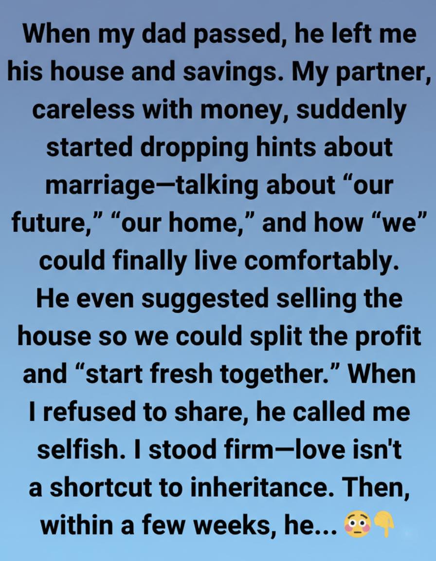 My partner of three years had always been somewhat careless with money, but when he learned about the inheritance, his attitude changed. Suddenly, he started dropping hints about marriage, talking about “our future,” and even suggesting selling the house to “start fresh together.”