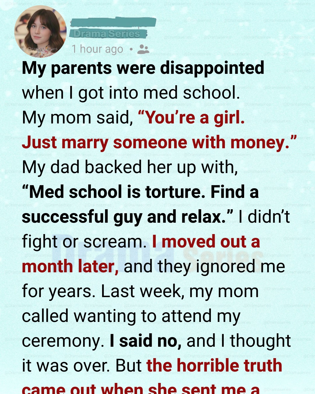 This morning, a letter from my mom arrived. She confessed she had gone to med school too, dropped out, spiraled into depression, and panicked when I got accepted. She had been following my life quietly, ashamed, and finally wrote, “I am proud of you. I always have been. I just didn’t know how to say it without facing my own failure.”
